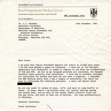 To comply with HIPAA patient privacy requirements and donor restrictions, we have redacted patient identifying information. Digital images of these letters were generously donated by Dr. Lorne J. Brandes, who retains ownership of the original letters.