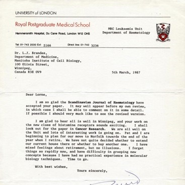 This collection of 11 letters were sent from Dr. David A. G. Galton to Dr. Lorne J. Brandes between 1973 and 1987. Of note, this collection includes a letter of recommendation for his colleague Dr. Brandes, describing Dr. Brandes’s research and clinical experience. In other letters, Dr. Galton discusses clinical research, including individual cases, and publishing. Several letters pertain to the progression of a single case; in these, we have given the patient the alias of Mr. Doe.